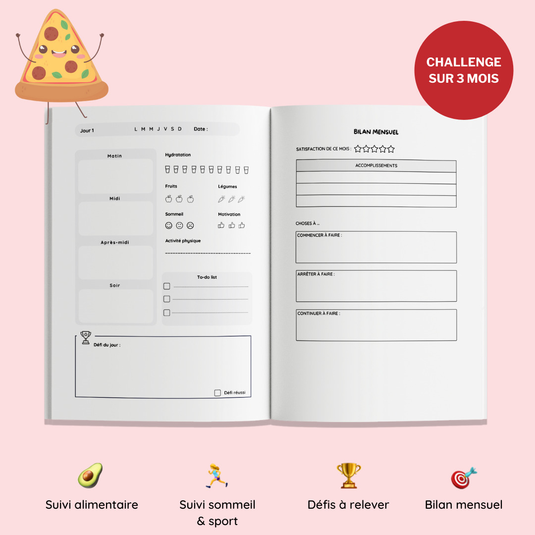 Ce journal sera votre compagnon idéal pour suivre quotidiennement votre progression et avoir un aperçu global de vos habitudes alimentaires durant 90 jours. Il vous permettra de mieux comprendre votre alimentation et ce que vous pourriez améliorer pour ainsi atteindre vos objectifs.
